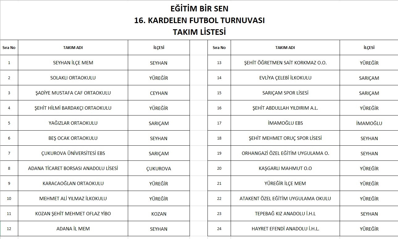 Turnuvanın kura çekimi heyecanı, Eğitim-Bir-Sen Adana Şubesi hizmet binasında yaşandı. Tertip komitesi ve takım temsilcilerinin hazır bulunduğu kura çekimi törenine, Eğitim-Bir-Sen Adana Şube Başkanı Mustafa Sarıgeçili ve Şube Sekreteri Süleyman Samsa da katılarak takımlara başarı dileklerinde bulundu.