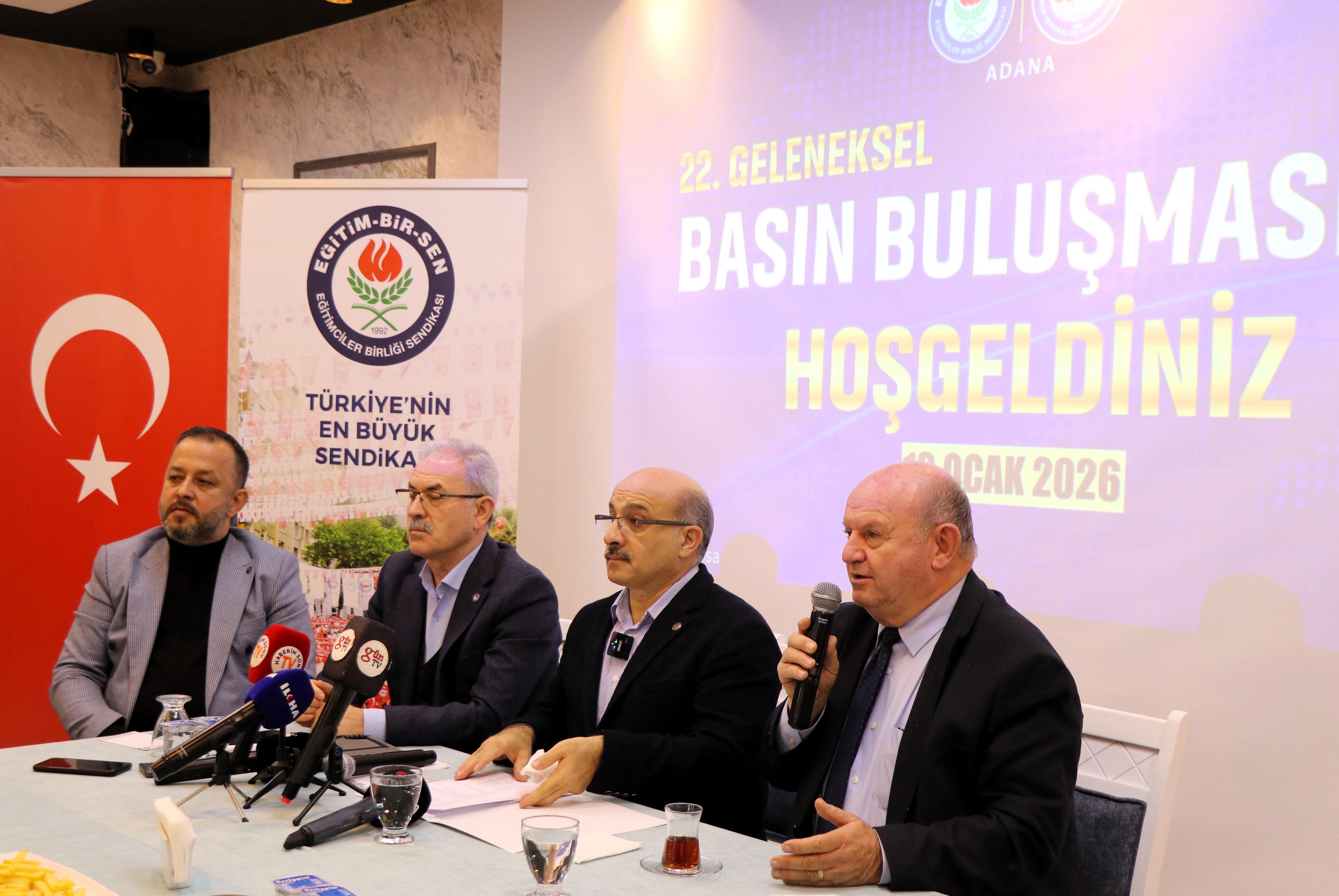 Eğitim-Bir-Sen Adana Şubesi’nin 10 Ocak Çalışan Gazeteciler Günü nedeniyle gerçekleştirdiği 22. Geleneksel Basın Buluşması’nda konuşan Şube Başkanı Mustafa Sarıgeçili öğretmen atamalarının adil, planlı ve kadrolu istihdama dayalı şekilde ele alınması gerektiğini vurgulayarak sendikanın 2025’te elde ettiği kazanımlar ve eğitim politikalarına yönelik araştırma-görüşlerini paylaştı.