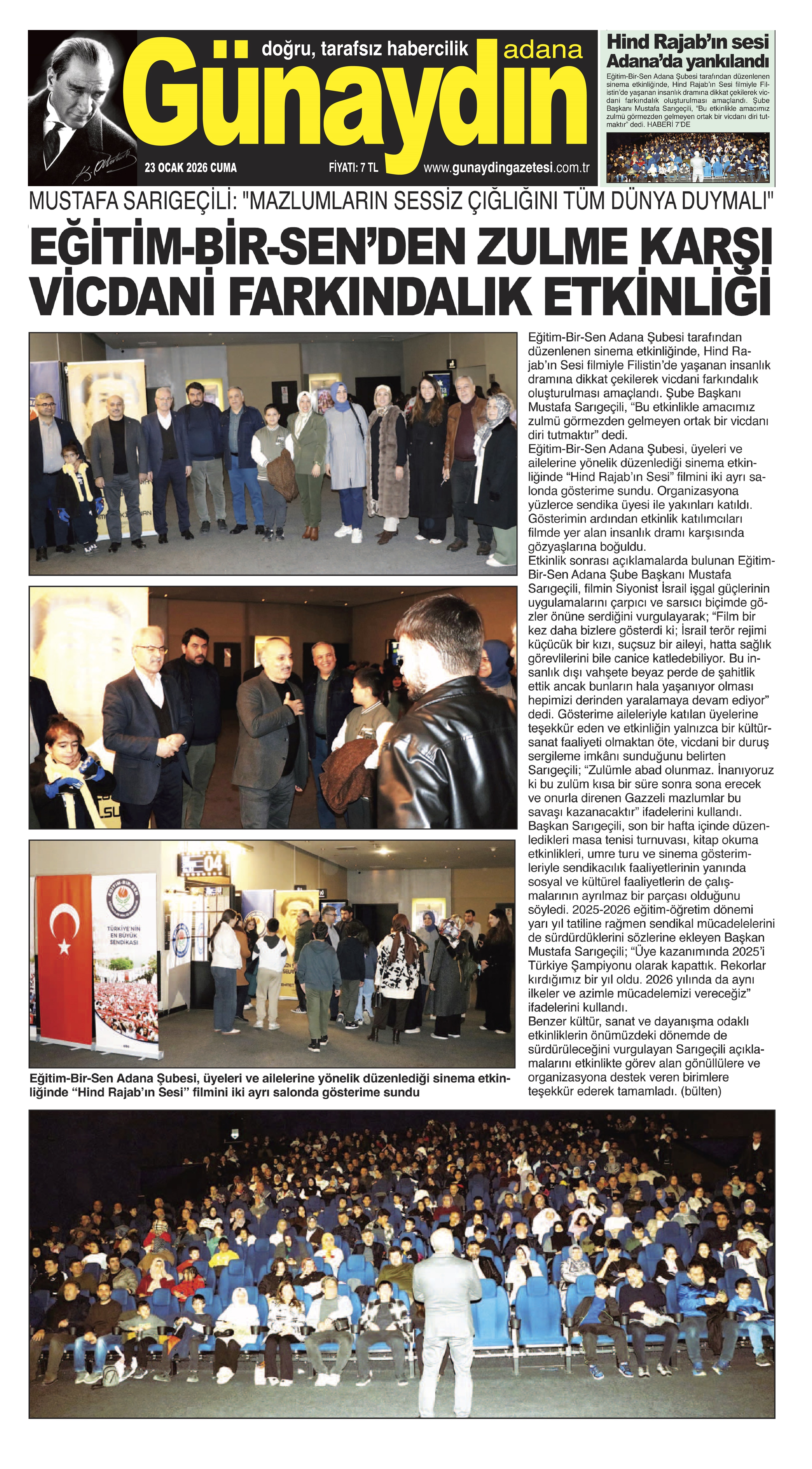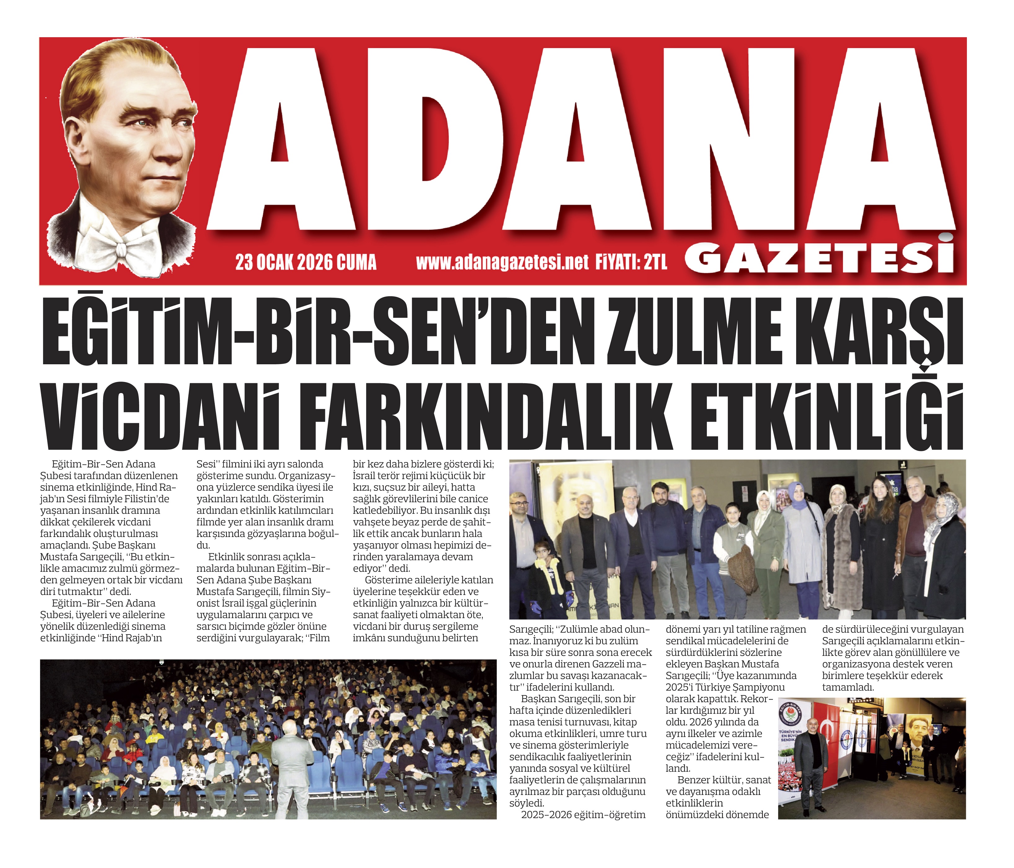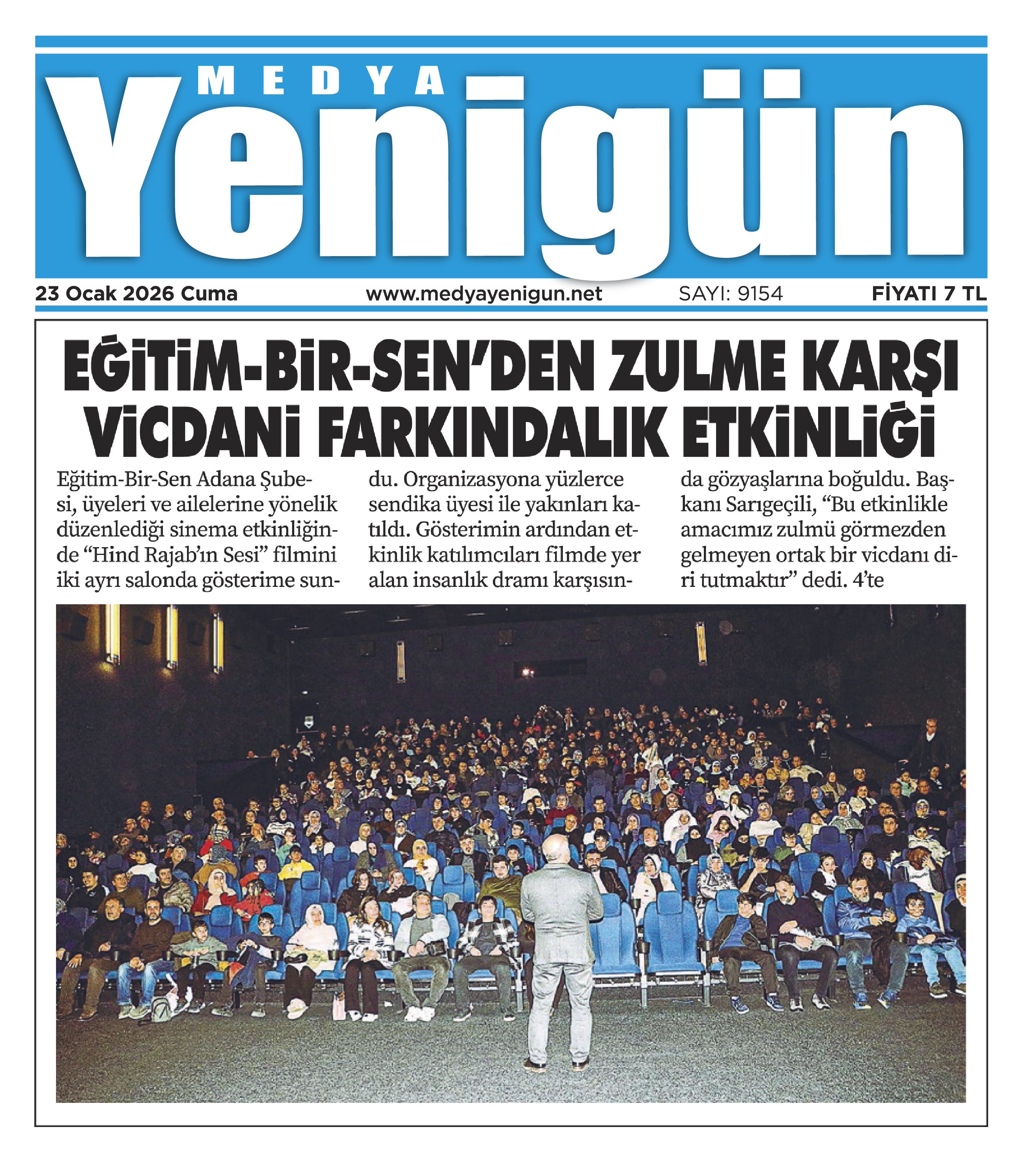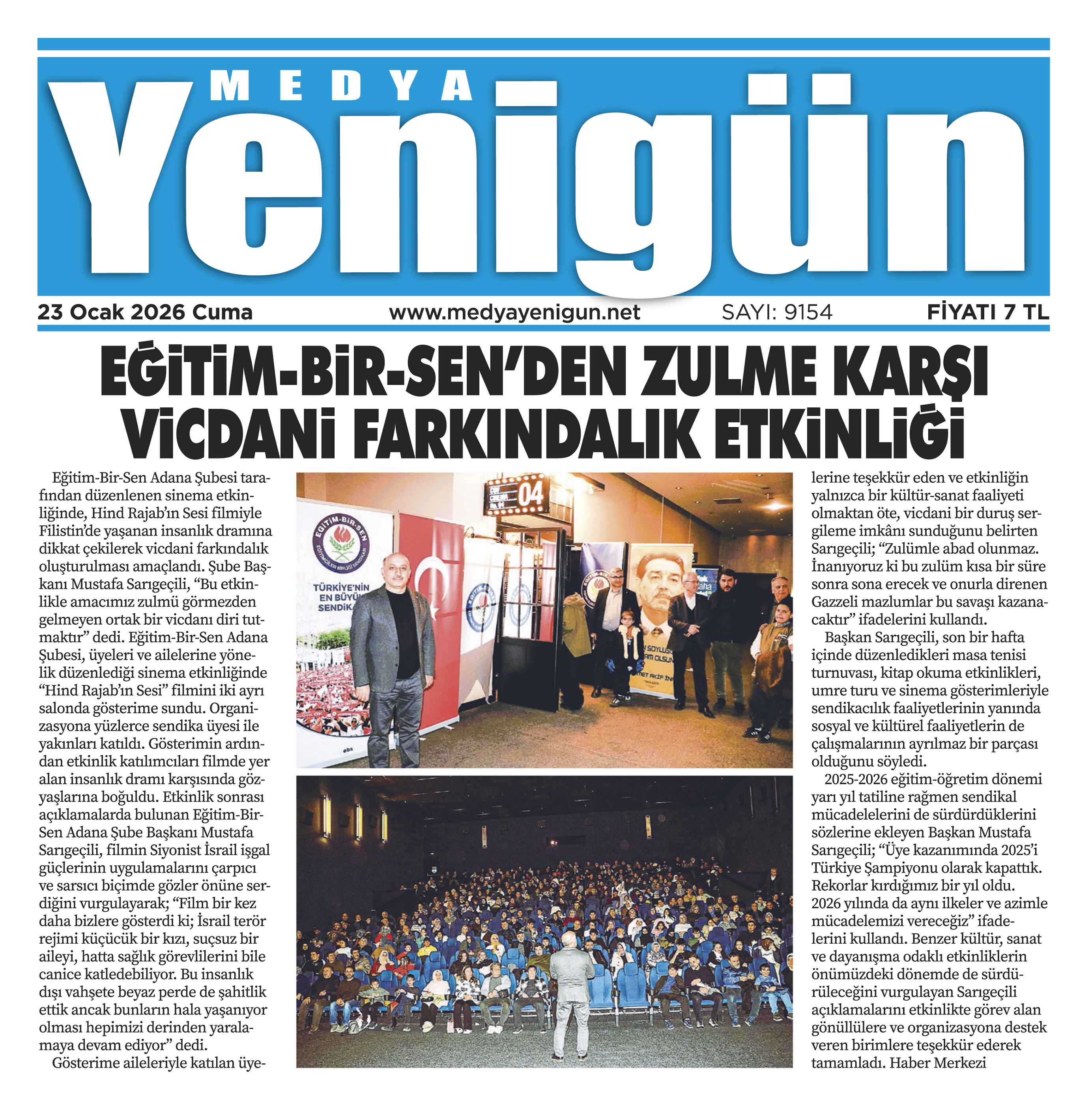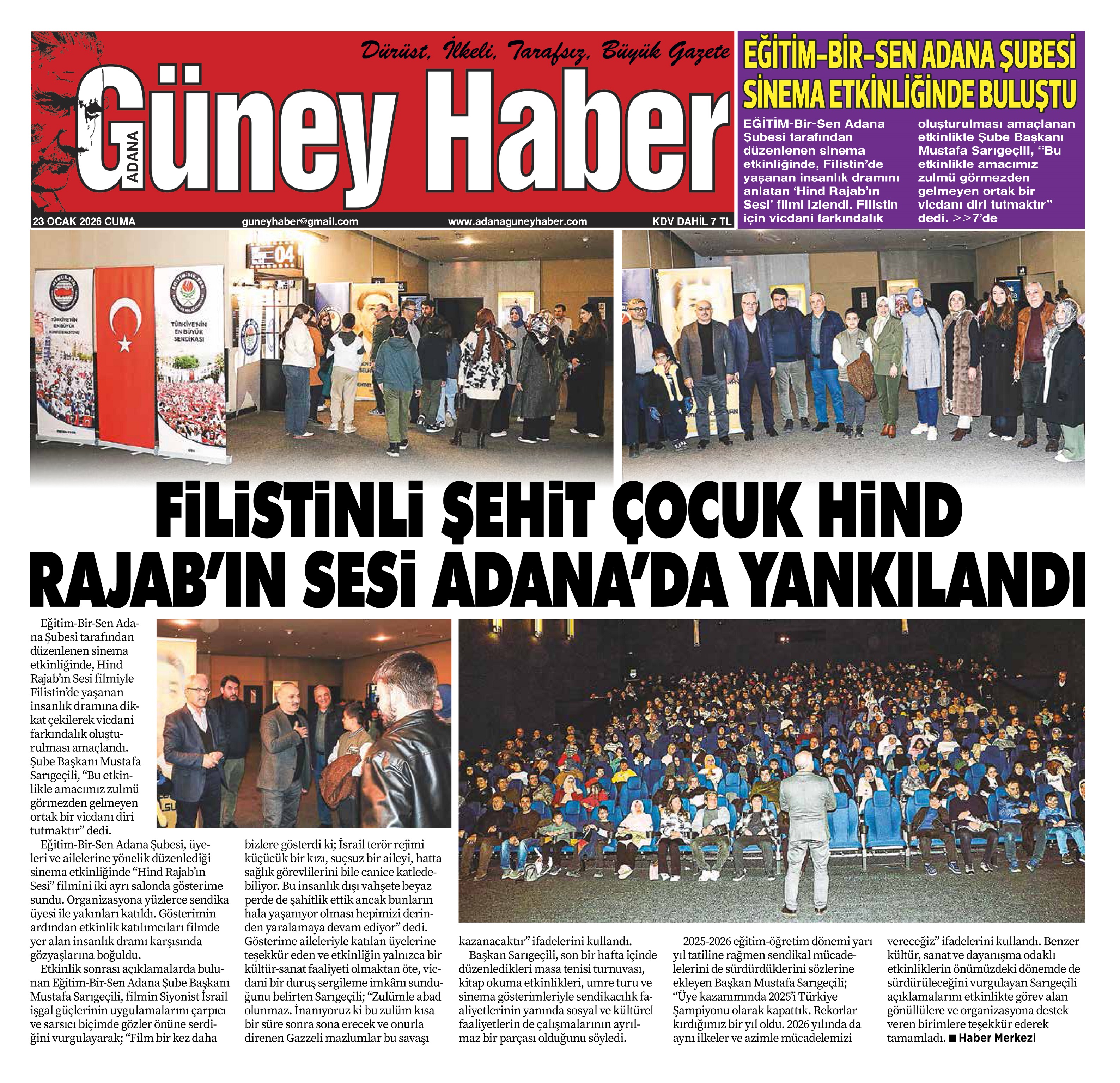 Eğitim-Bir-Sen Adana Şubesi tarafından düzenlenen sinema etkinliğinde, Hind Rajab’ın Sesi filmiyle Filistin’de yaşanan insanlık dramına dikkat çekilerek vicdani farkındalık oluşturulması amaçlandı. Şube Başkanı Mustafa Sarıgeçili, “Bu etkinlikle amacımız zulmü görmezden gelmeyen ortak bir vicdanı diri tutmaktır” dedi.