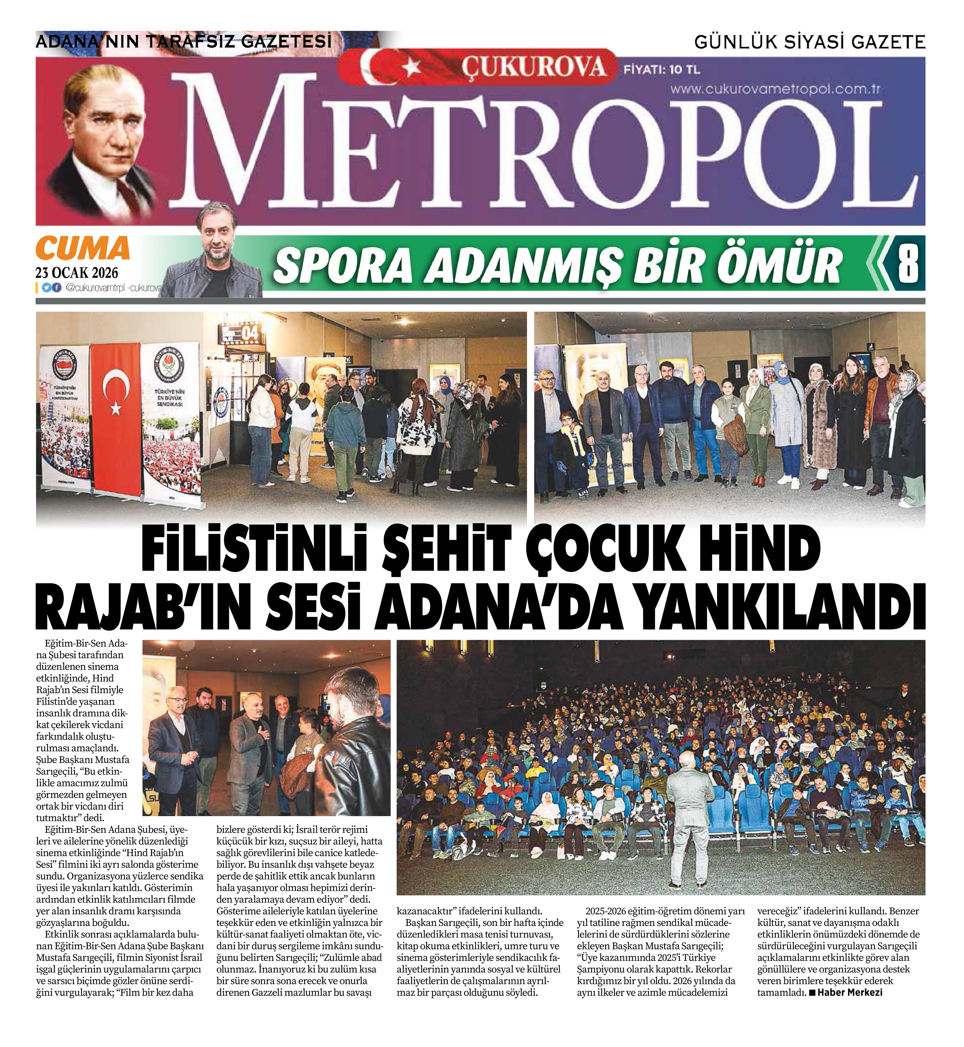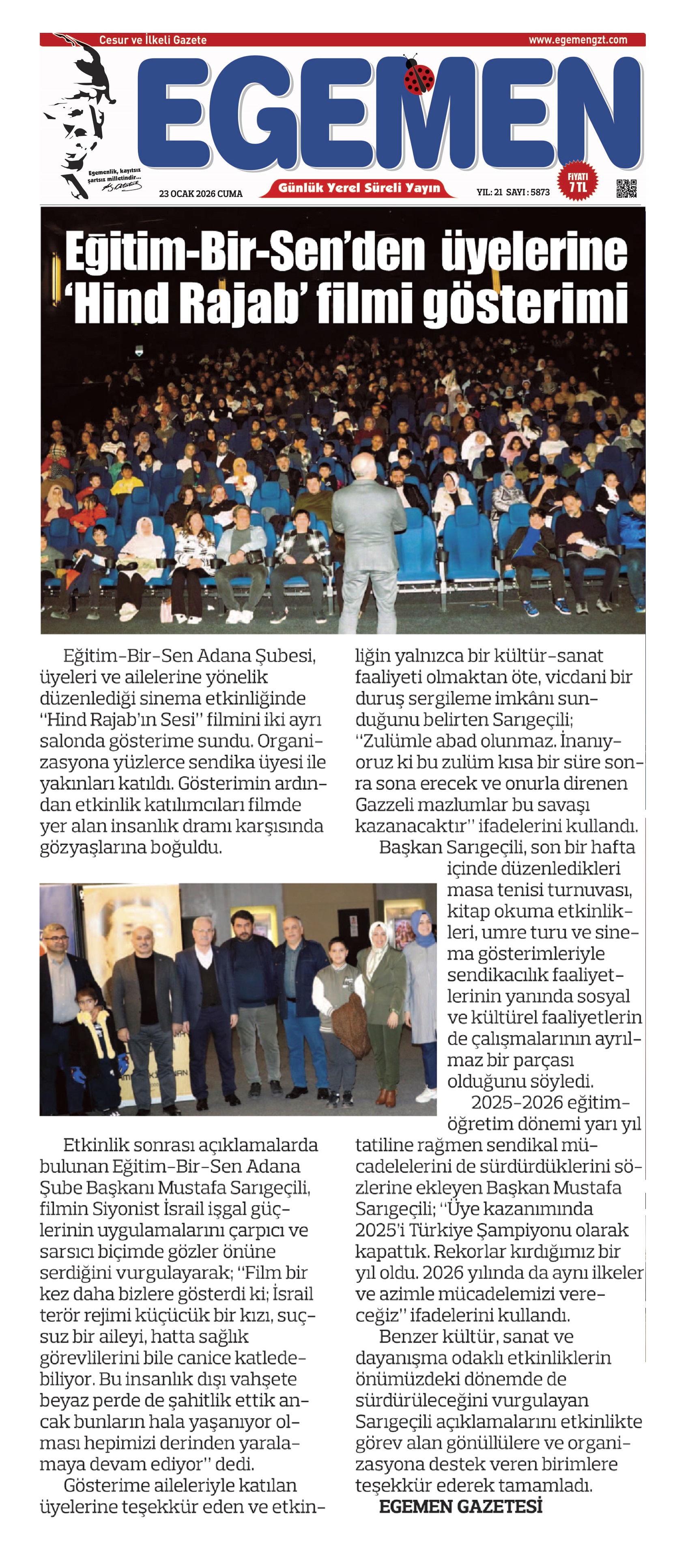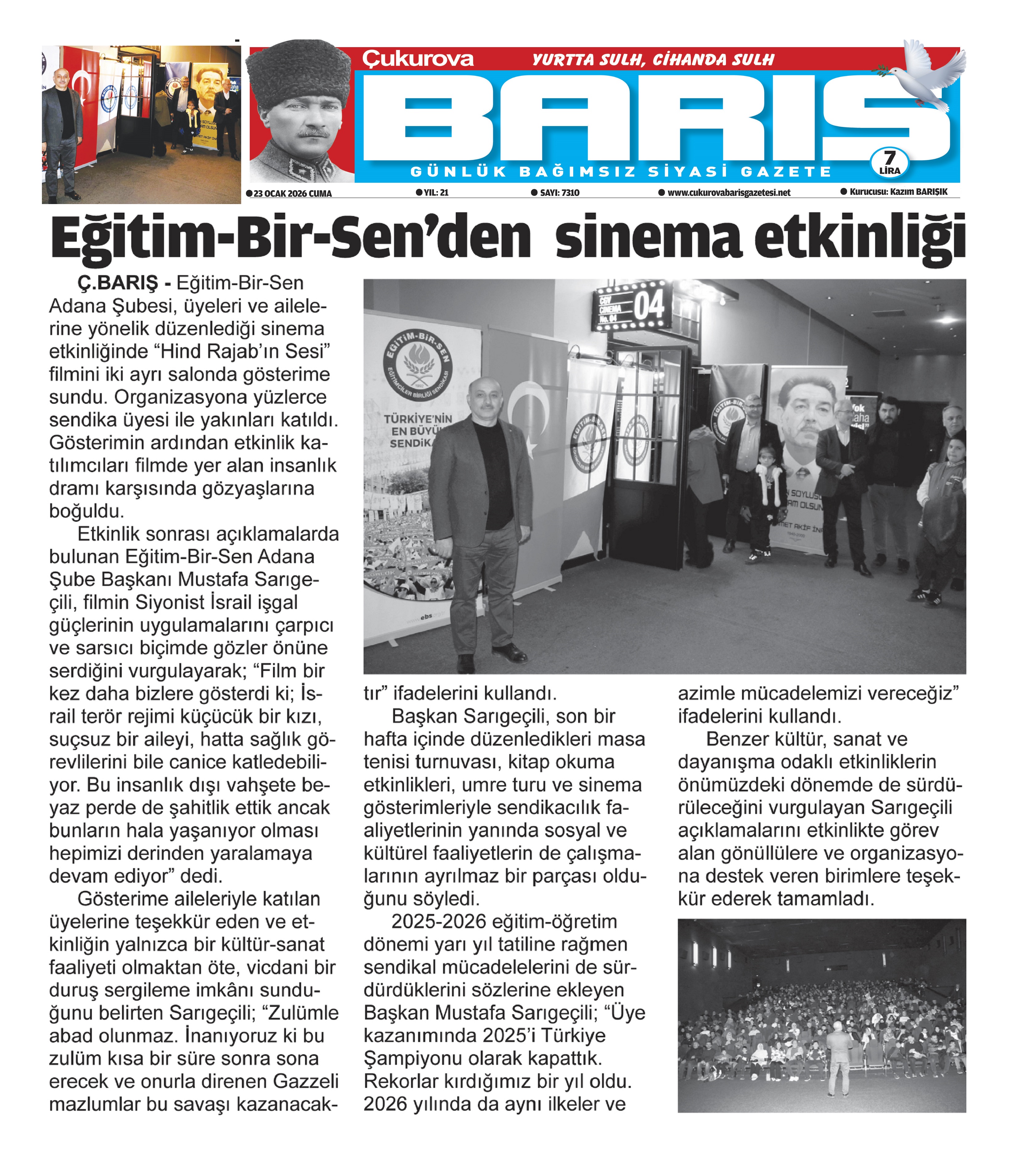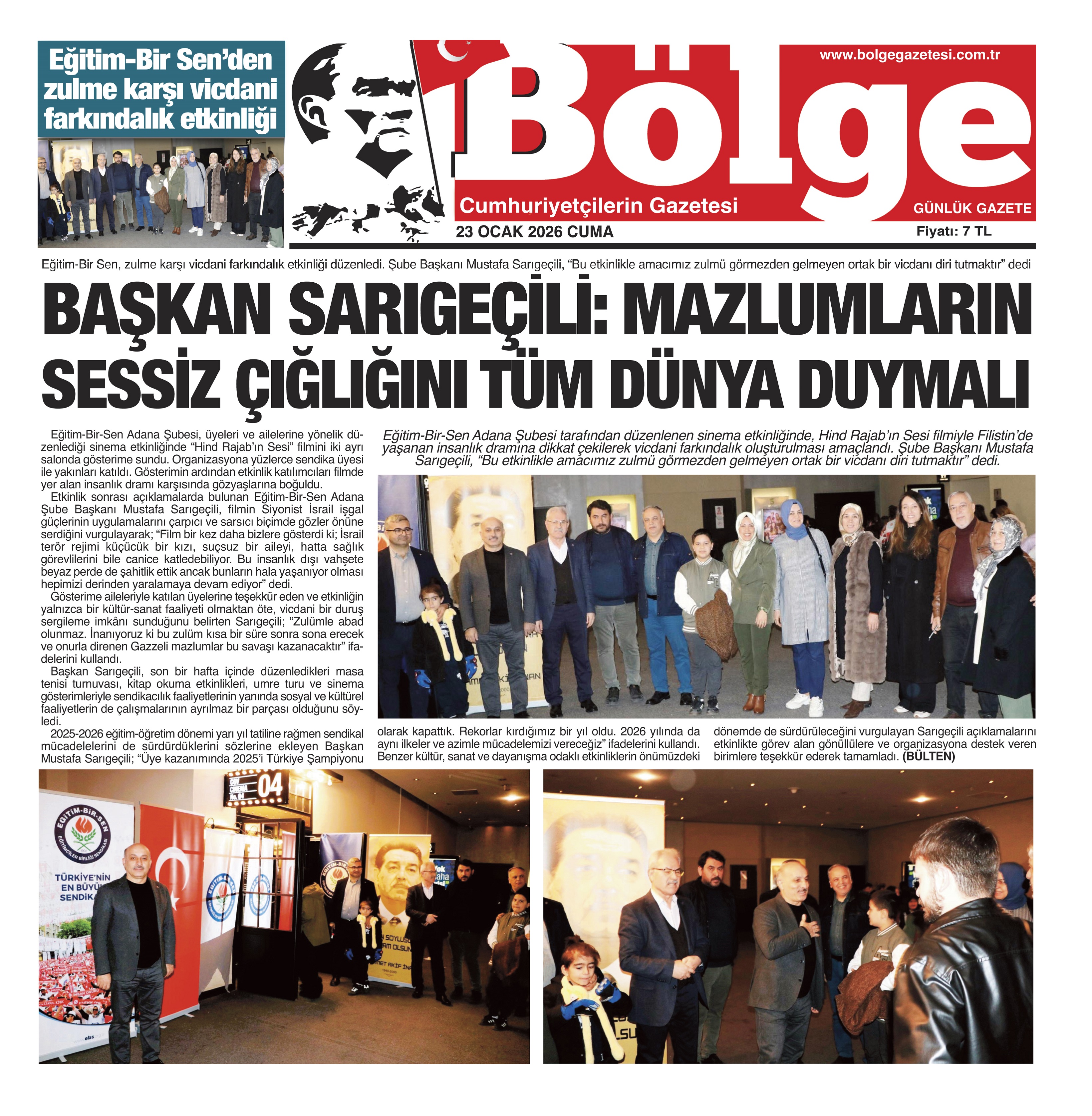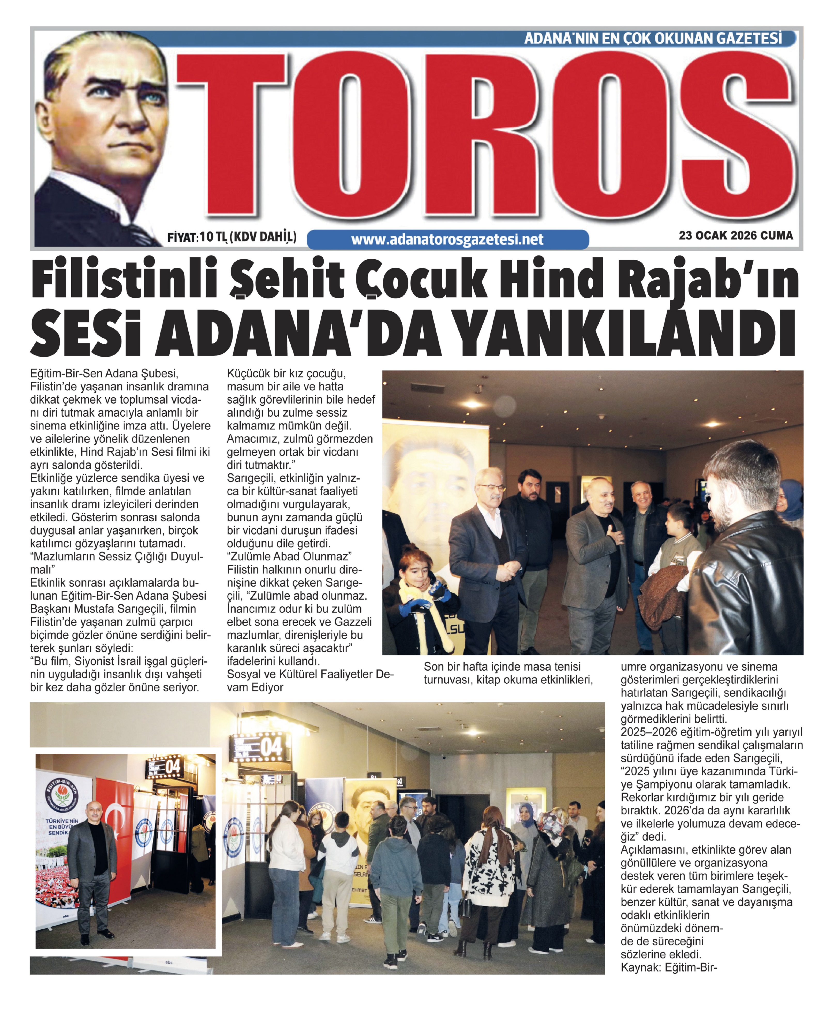 Eğitim-Bir-Sen Adana Şubesi tarafından düzenlenen sinema etkinliğinde, Hind Rajab’ın Sesi filmiyle Filistin’de yaşanan insanlık dramına dikkat çekilerek vicdani farkındalık oluşturulması amaçlandı. Şube Başkanı Mustafa Sarıgeçili, “Bu etkinlikle amacımız zulmü görmezden gelmeyen ortak bir vicdanı diri tutmaktır” dedi.