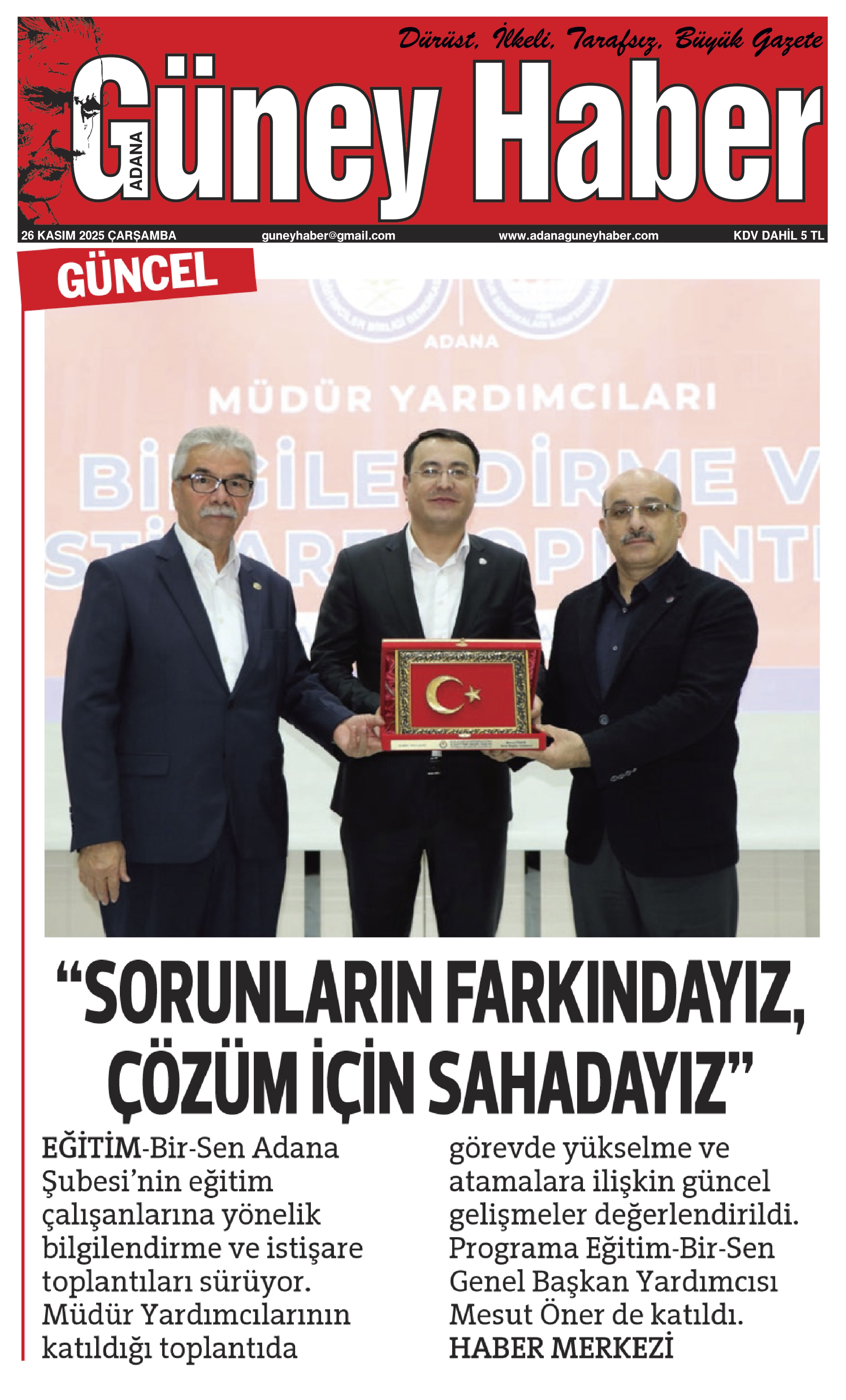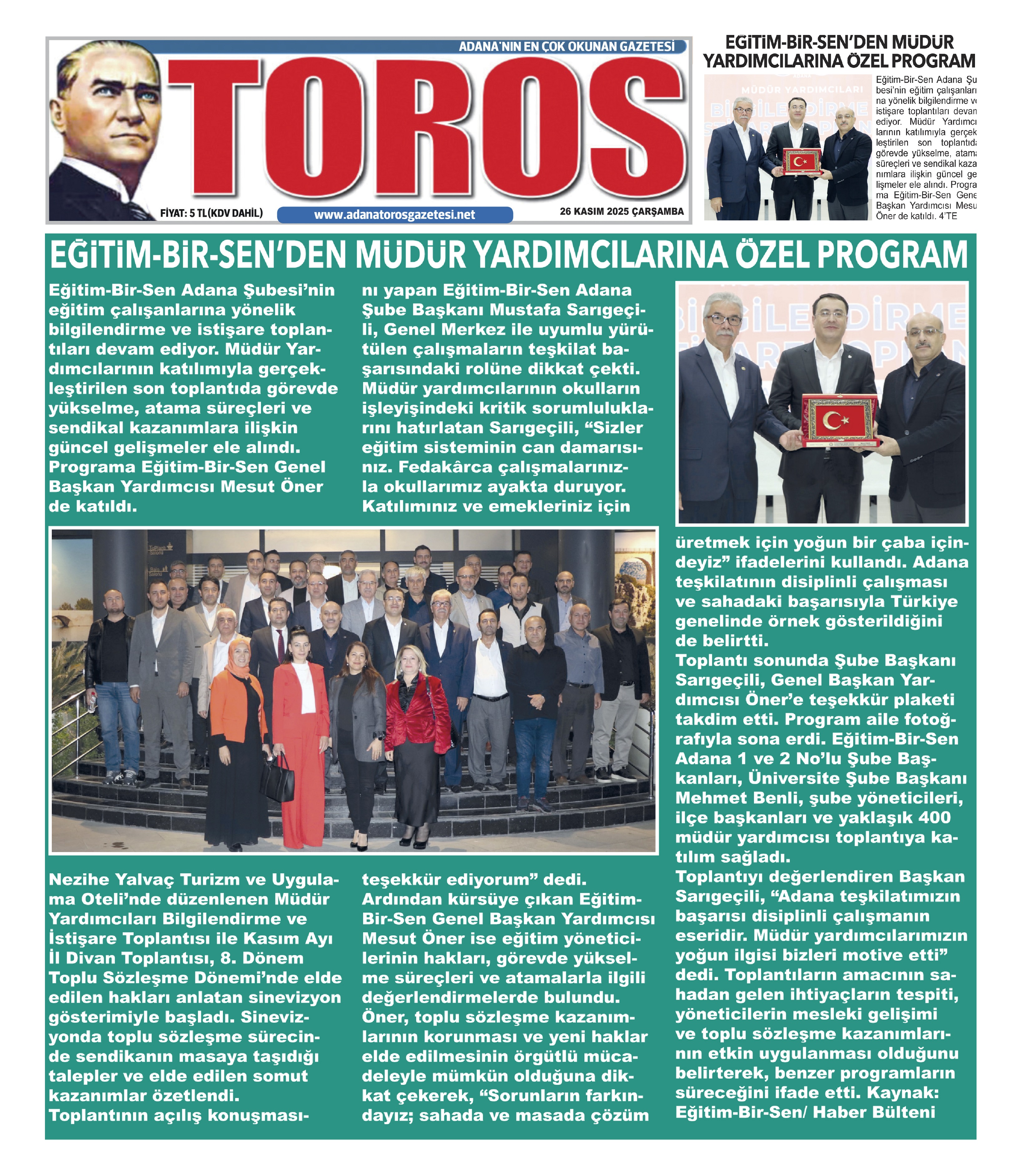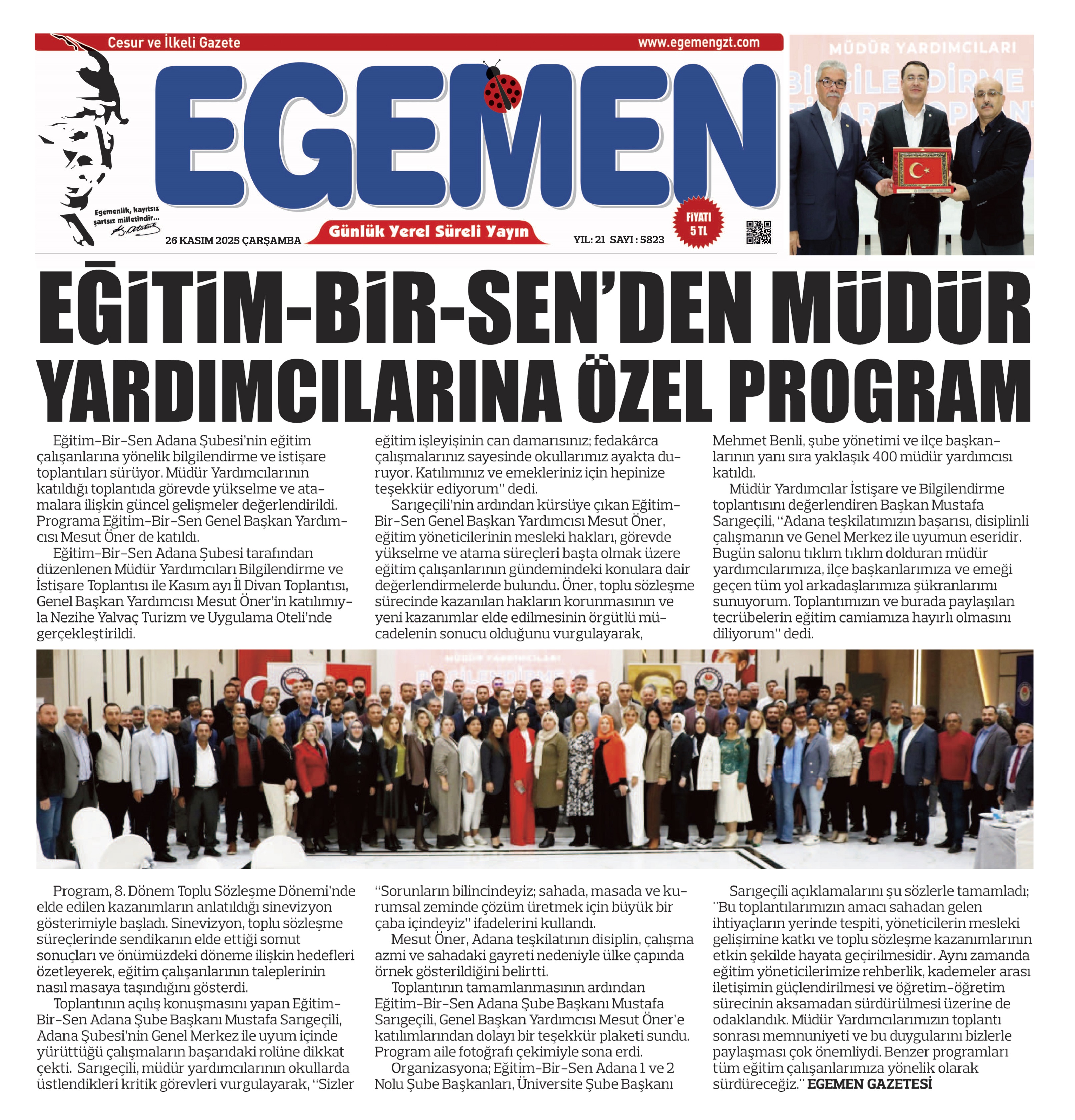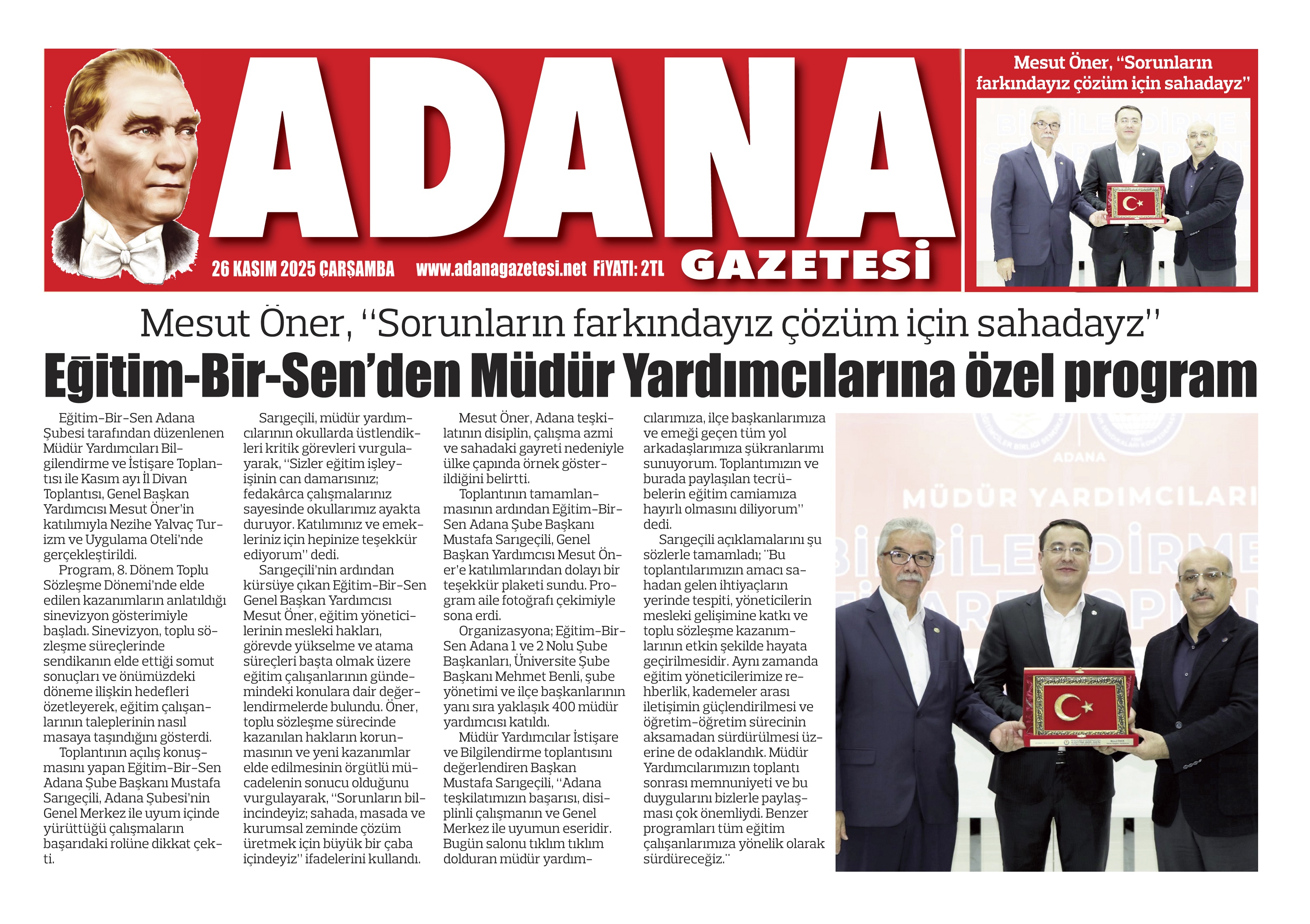 Toplantının tamamlanmasının ardından Eğitim-Bir-Sen Adana Şube Başkanı Mustafa Sarıgeçili, Genel Başkan Yardımcısı Mesut Öner’e katılımlarından dolayı bir teşekkür plaketi sundu. Program aile fotoğrafı çekimiyle sona erdi.