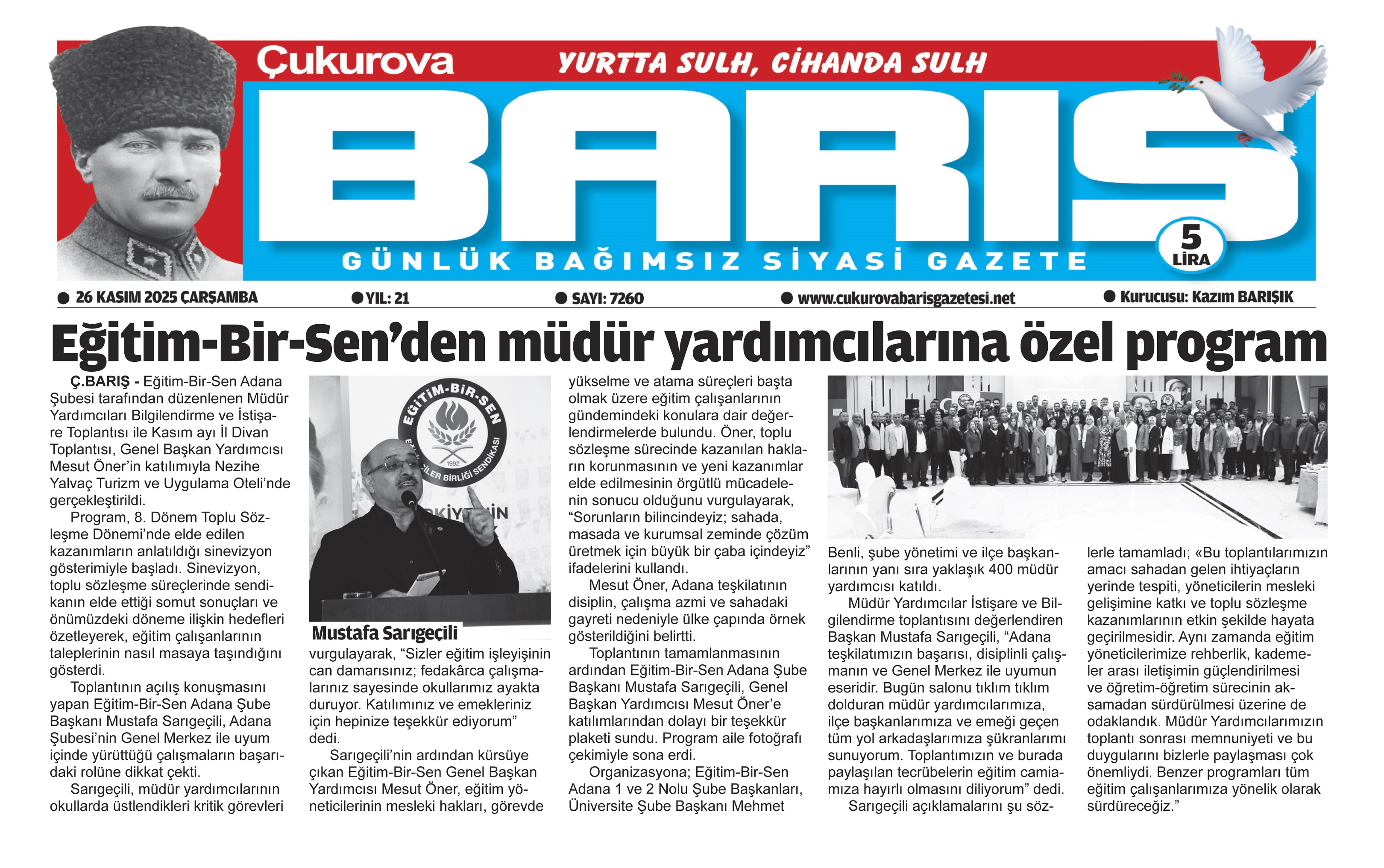 Müdür Yardımcılar İstişare ve Bilgilendirme toplantısını değerlendiren Başkan Mustafa Sarıgeçili, “Adana teşkilatımızın başarısı, disiplinli çalışmanın ve Genel Merkez ile uyumun eseridir. Bugün salonu tıklım tıklım dolduran müdür yardımcılarımıza, ilçe başkanlarımıza ve emeği geçen tüm yol arkadaşlarımıza şükranlarımı sunuyorum. Toplantımızın ve burada paylaşılan tecrübelerin eğitim camiamıza hayırlı olmasını diliyorum” dedi.