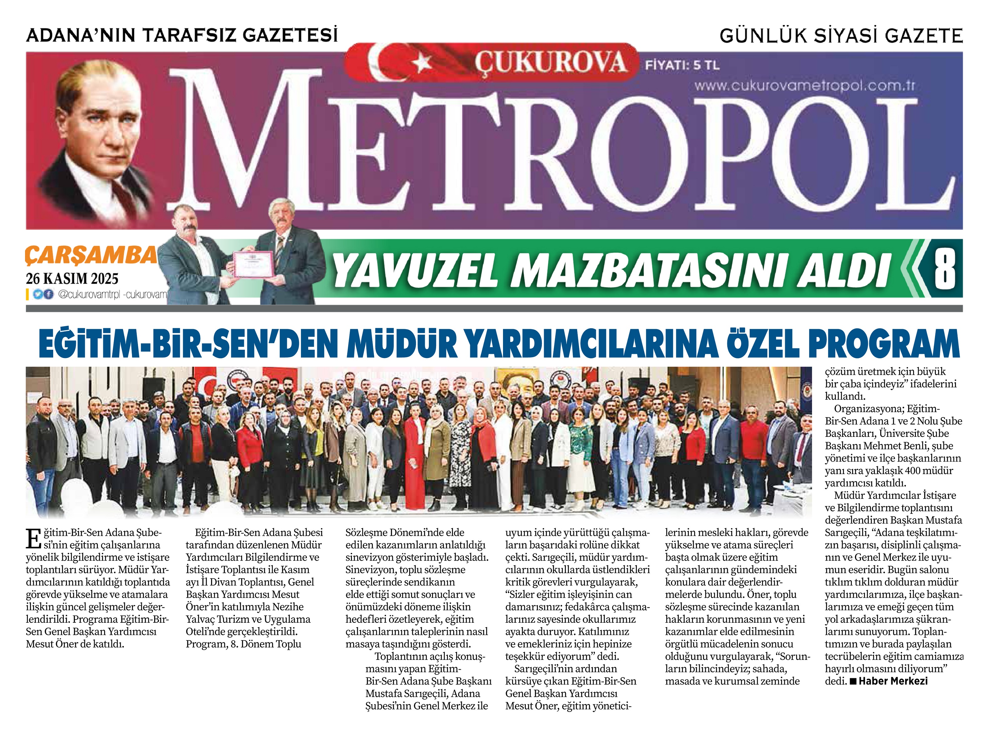 Organizasyona; Eğitim-Bir-Sen Adana 1 ve 2 Nolu Şube Başkanları, Üniversite Şube Başkanı Mehmet Benli, şube yönetimi ve ilçe başkanlarının yanı sıra yaklaşık 400 müdür yardımcısı katıldı.