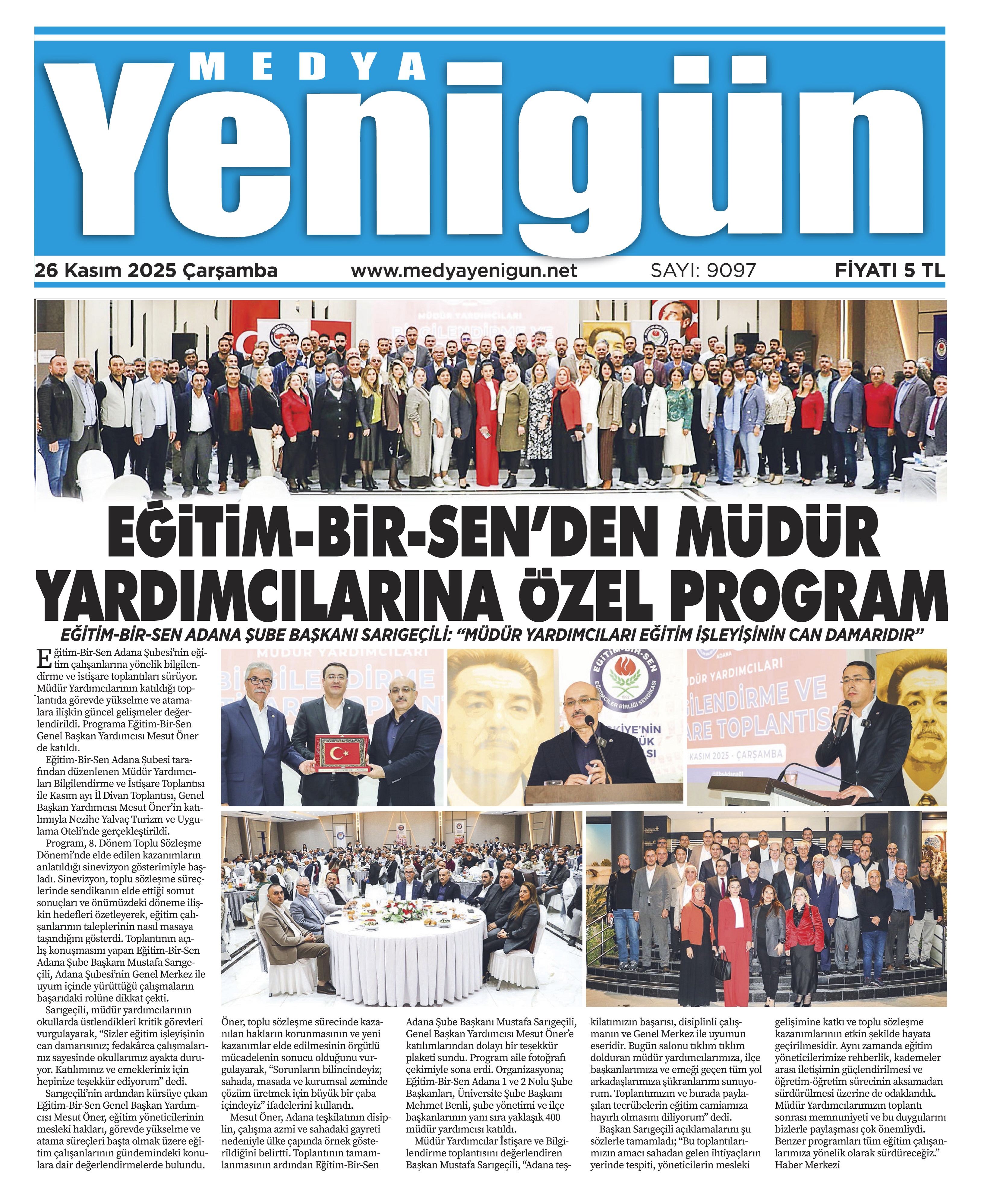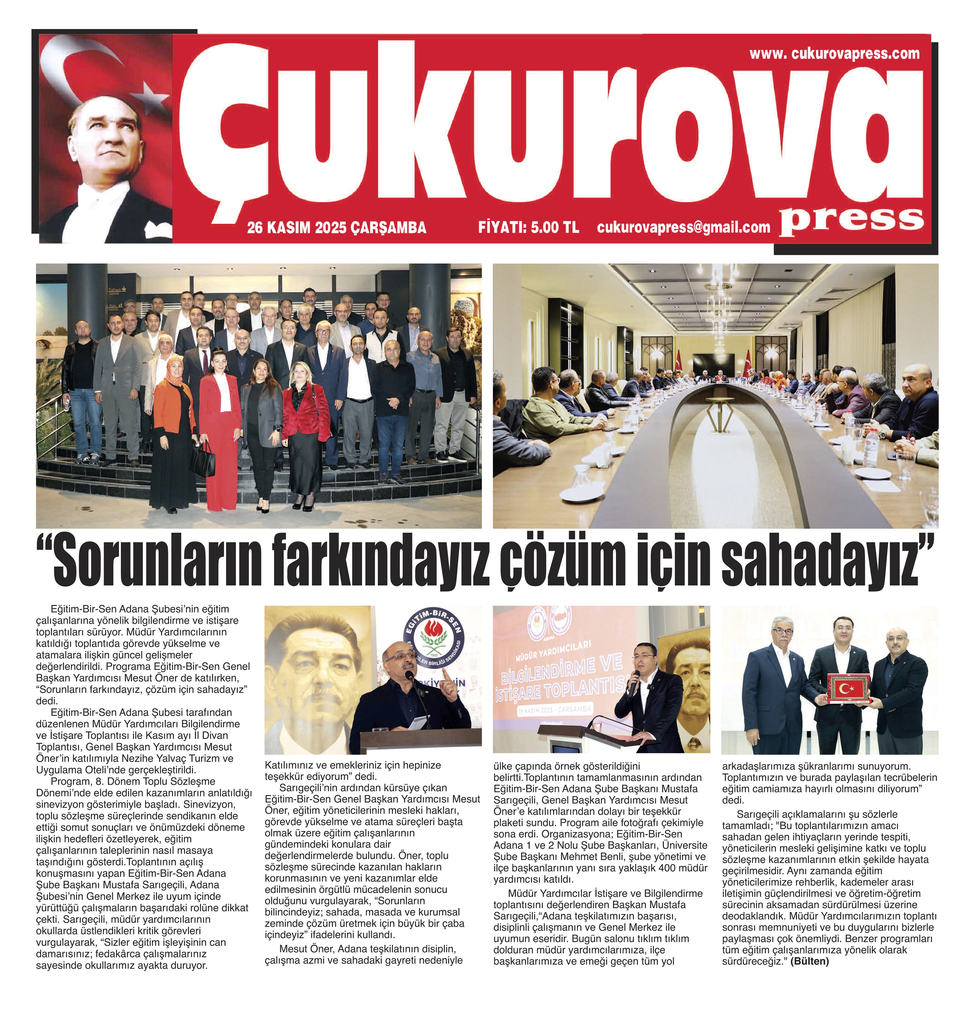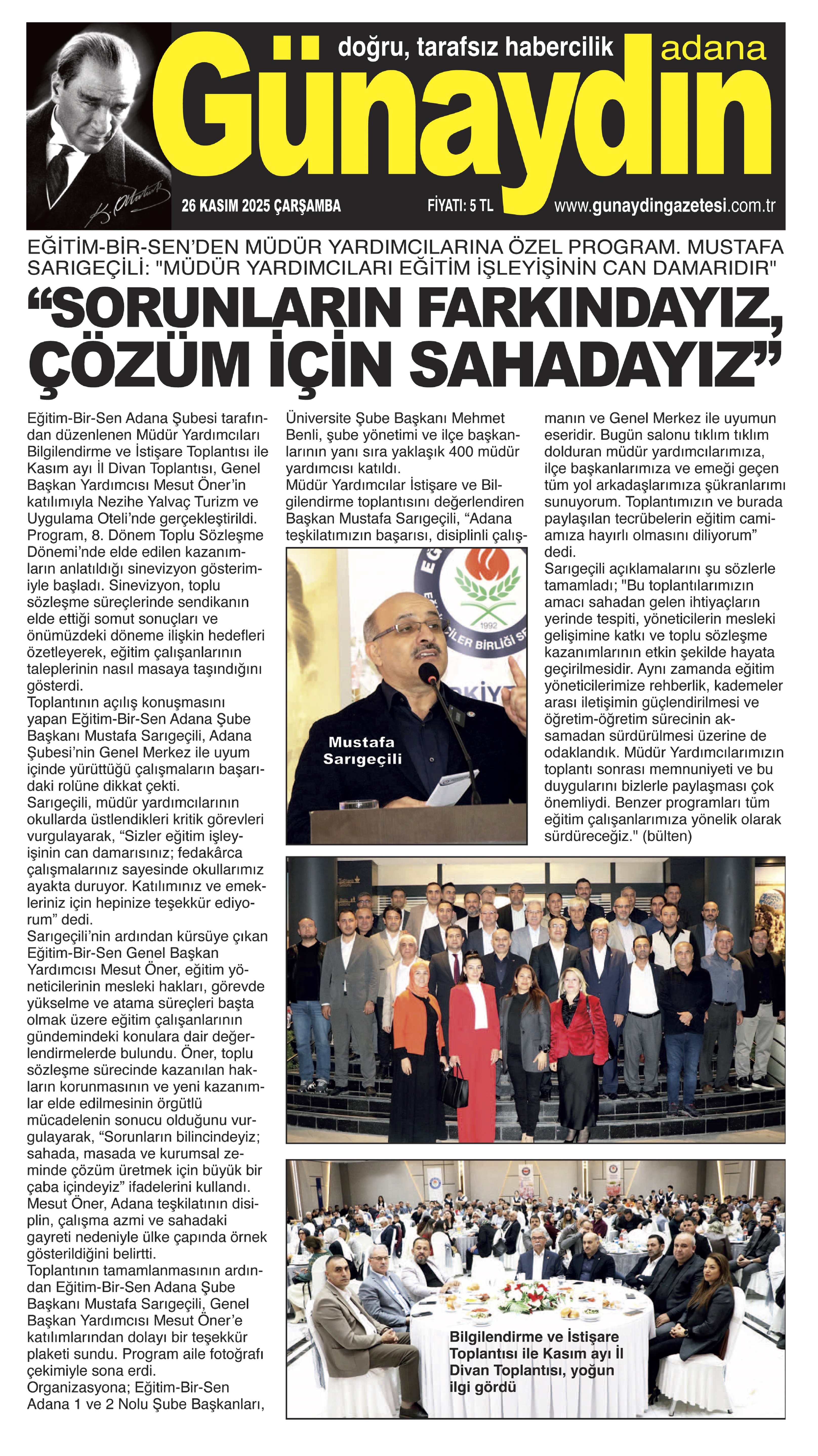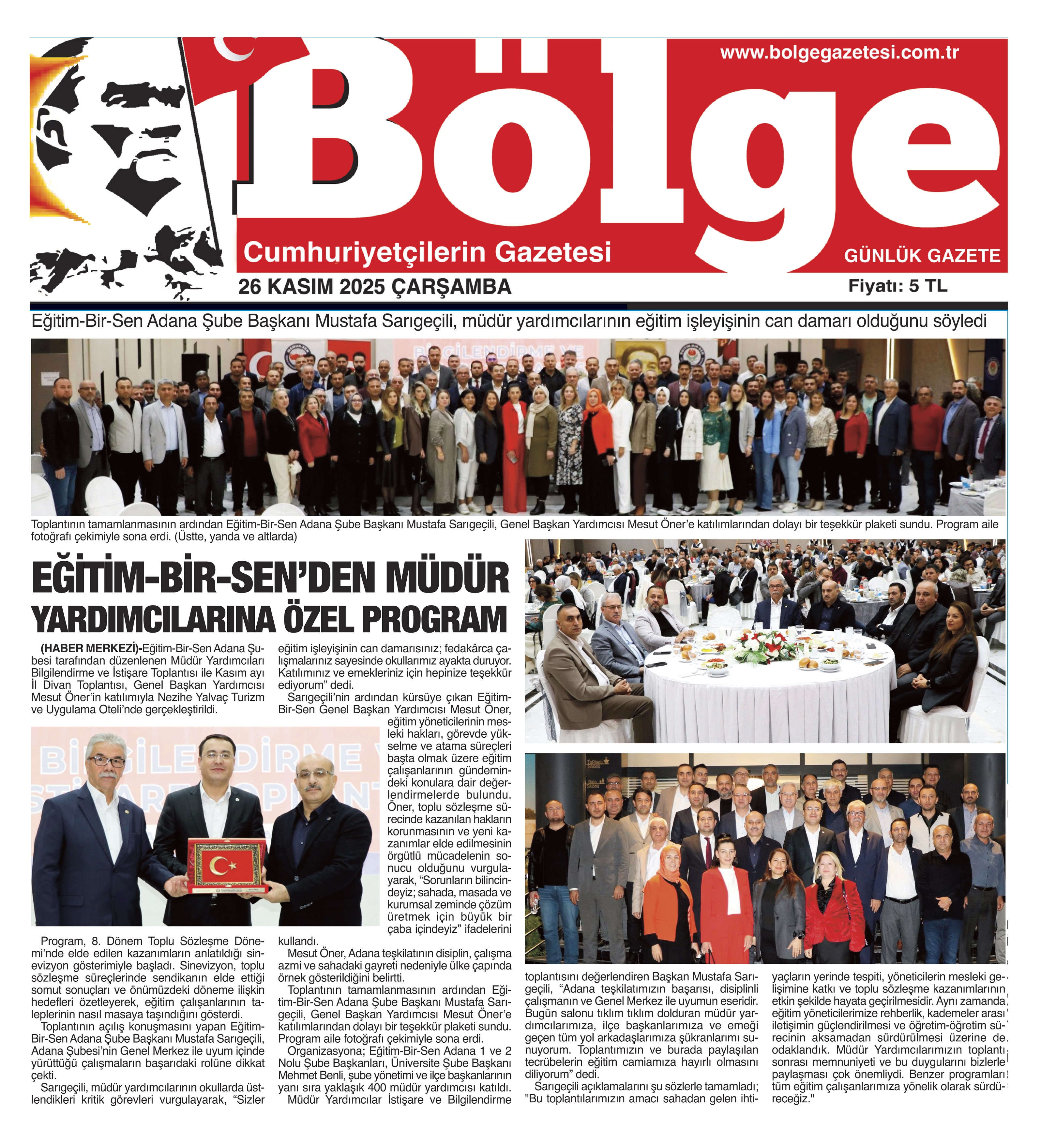 Eğitim-Bir-Sen Adana Şubesi tarafından düzenlenen Müdür Yardımcıları Bilgilendirme ve İstişare Toplantısı ile Kasım ayı İl Divan Toplantısı, Genel Başkan Yardımcısı Mesut Öner’in katılımıyla Nezihe Yalvaç Turizm ve Uygulama Oteli’nde gerçekleştirildi.